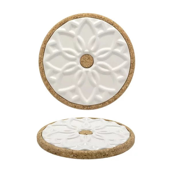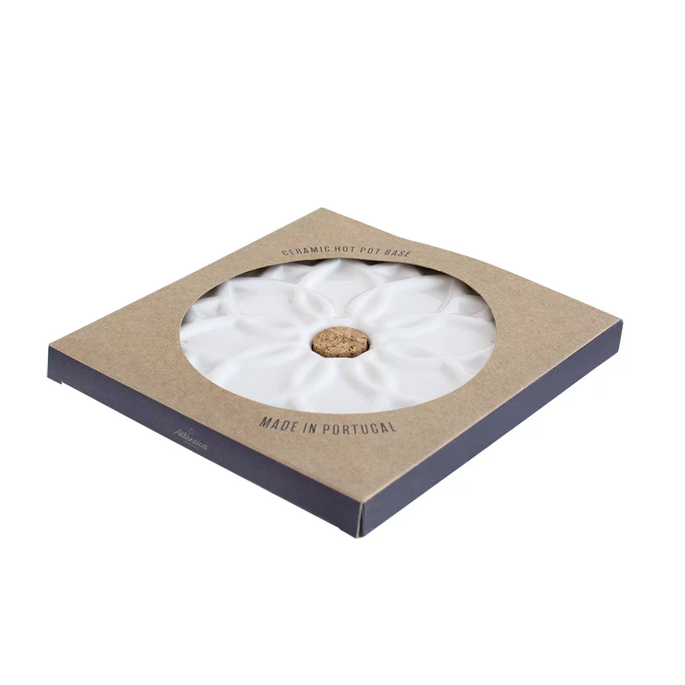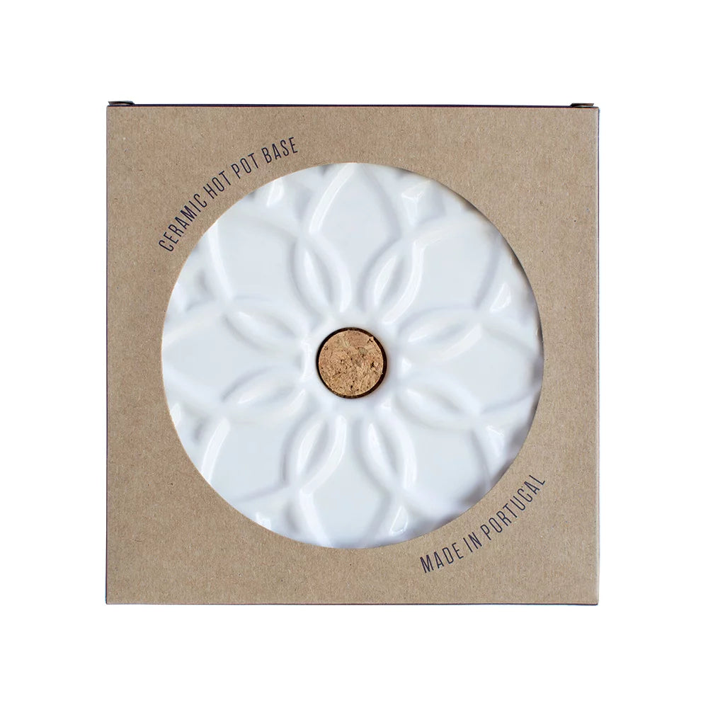 This ceramic hot pot stand Elvira in white boasts a relief pattern and cork base, drawing inspiration from traditional Portuguese tiles. With a history of cultural exchange and artistic expression spanning five centuries, Portugal's iconic tiles hold a unique status as both decorative and architectural pieces.