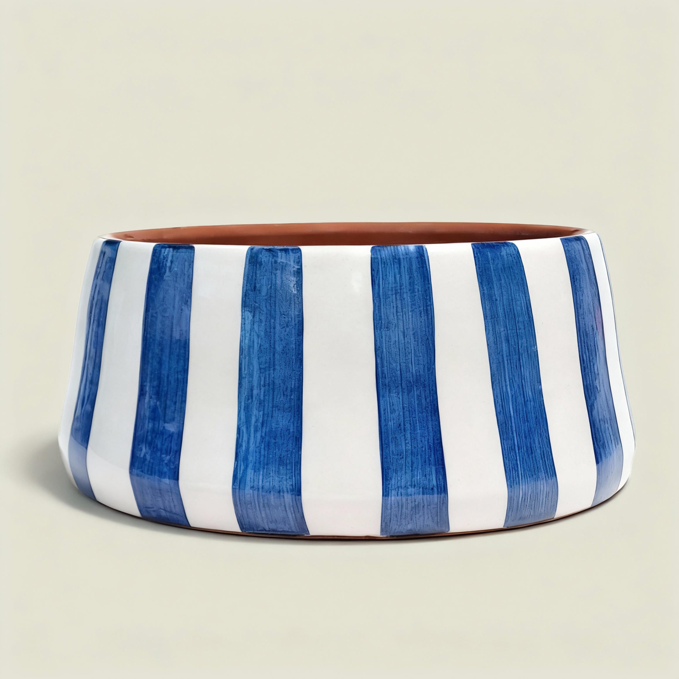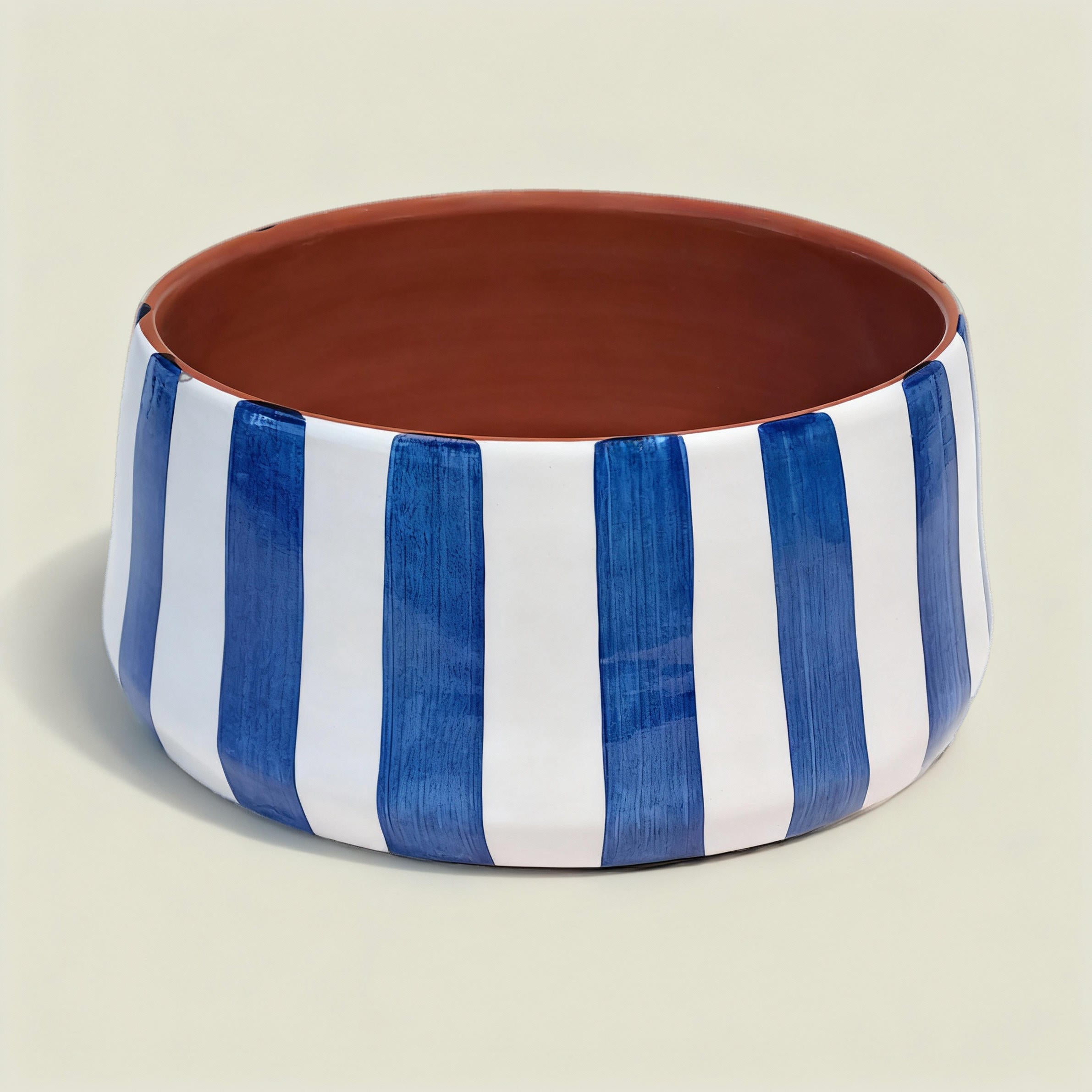 This Terracotta Large Tapered Bowl with a blue bold stripes design adds a touch of traditional charm with a modern twist to any table setting. Expertly wheel-thrown and hand-painted in Portugal. This large bowl is suitable for serving salads, desserts, displaying or storing fruits, or as a decorative piece. Versatile and stylish, it's a must-have for any home.