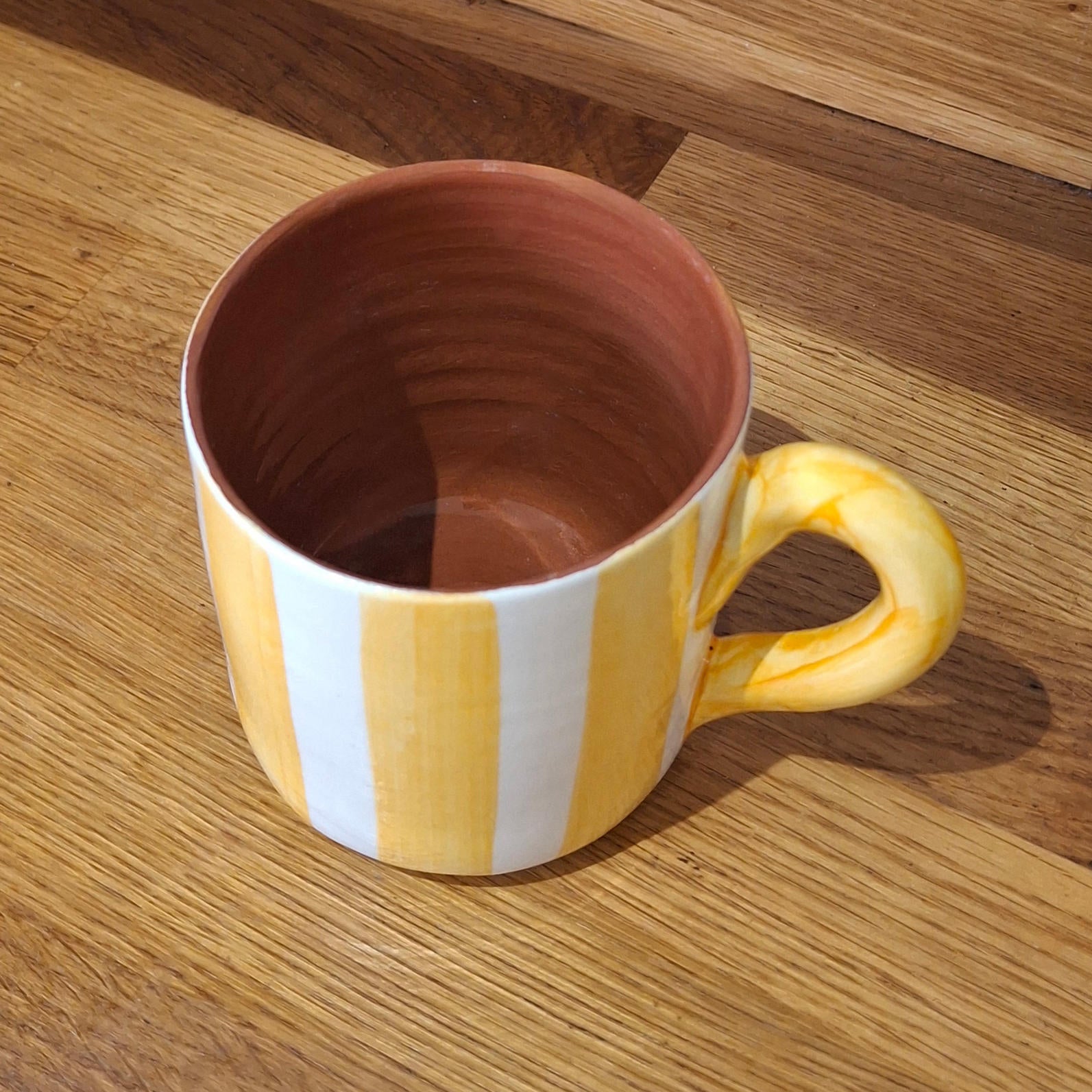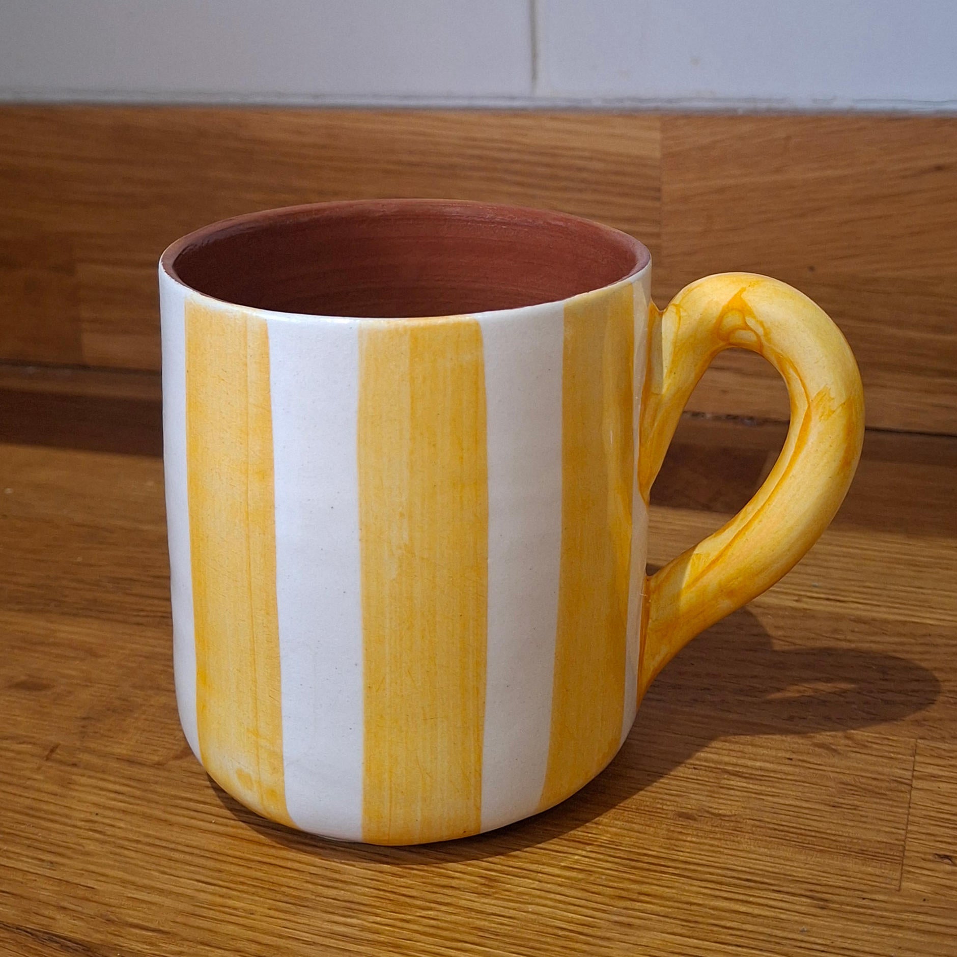 This Terracotta Mugs with a yellow bold vertical stripes design add a touch of traditional charm with a modern twist to any table setting. Expertly wheel-thrown and hand-painted in Portugal. This mug is great for a variety of drinks, such as coffee, teas, herbal infusions, and hot chocolate. With its versatility and stylish design, it is an essential addition to any household.