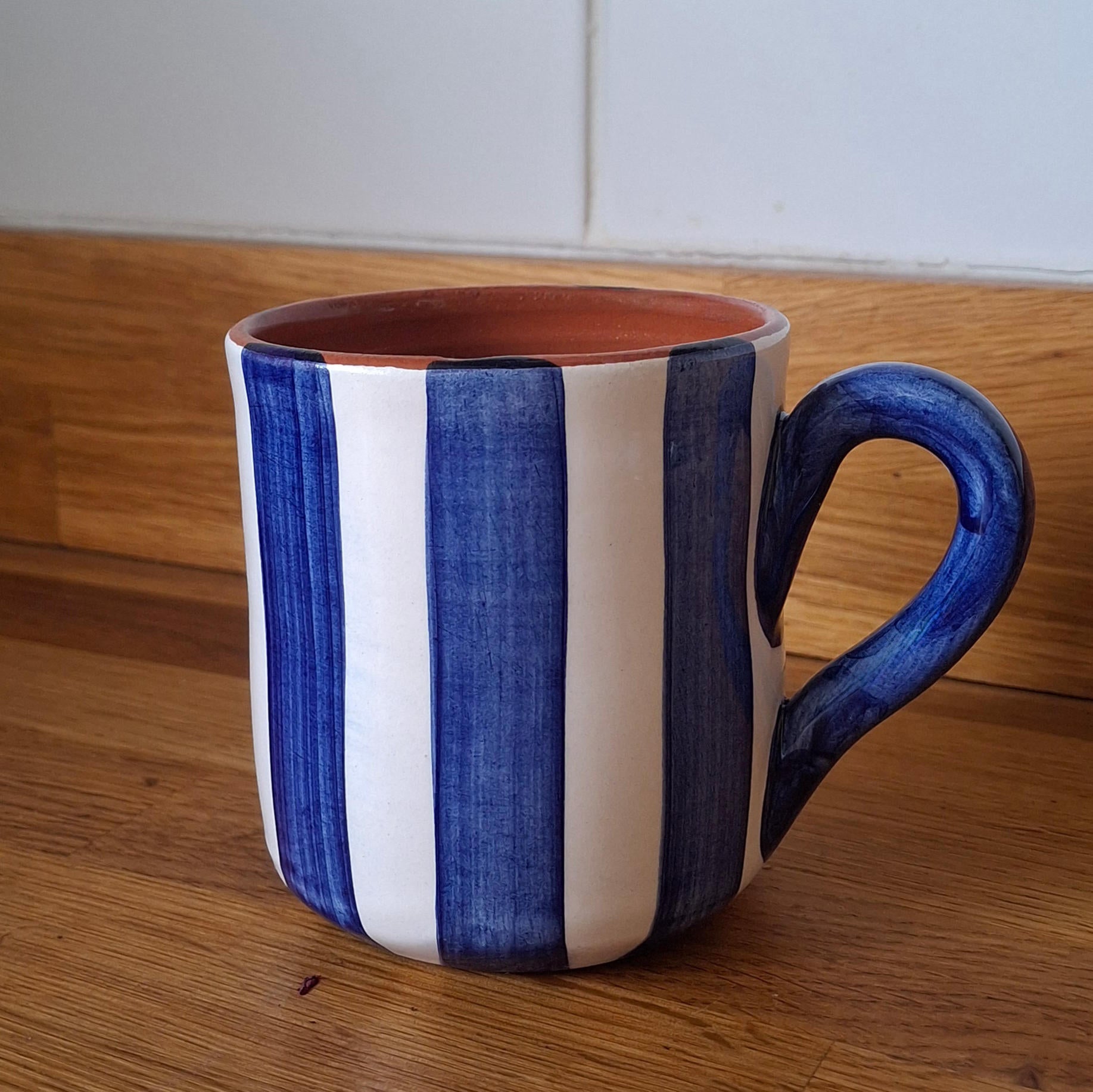 These trio of  Terracotta Mugs with bold vertical stripes add a touch of traditional charm with a modern twist to any table setting. Expertly wheel-thrown and hand-painted in Portugal. This mug is great for a variety of drinks, such as coffee, teas, herbal infusions, and hot chocolate. With its versatility and stylish design, it is an essential addition to any household.
