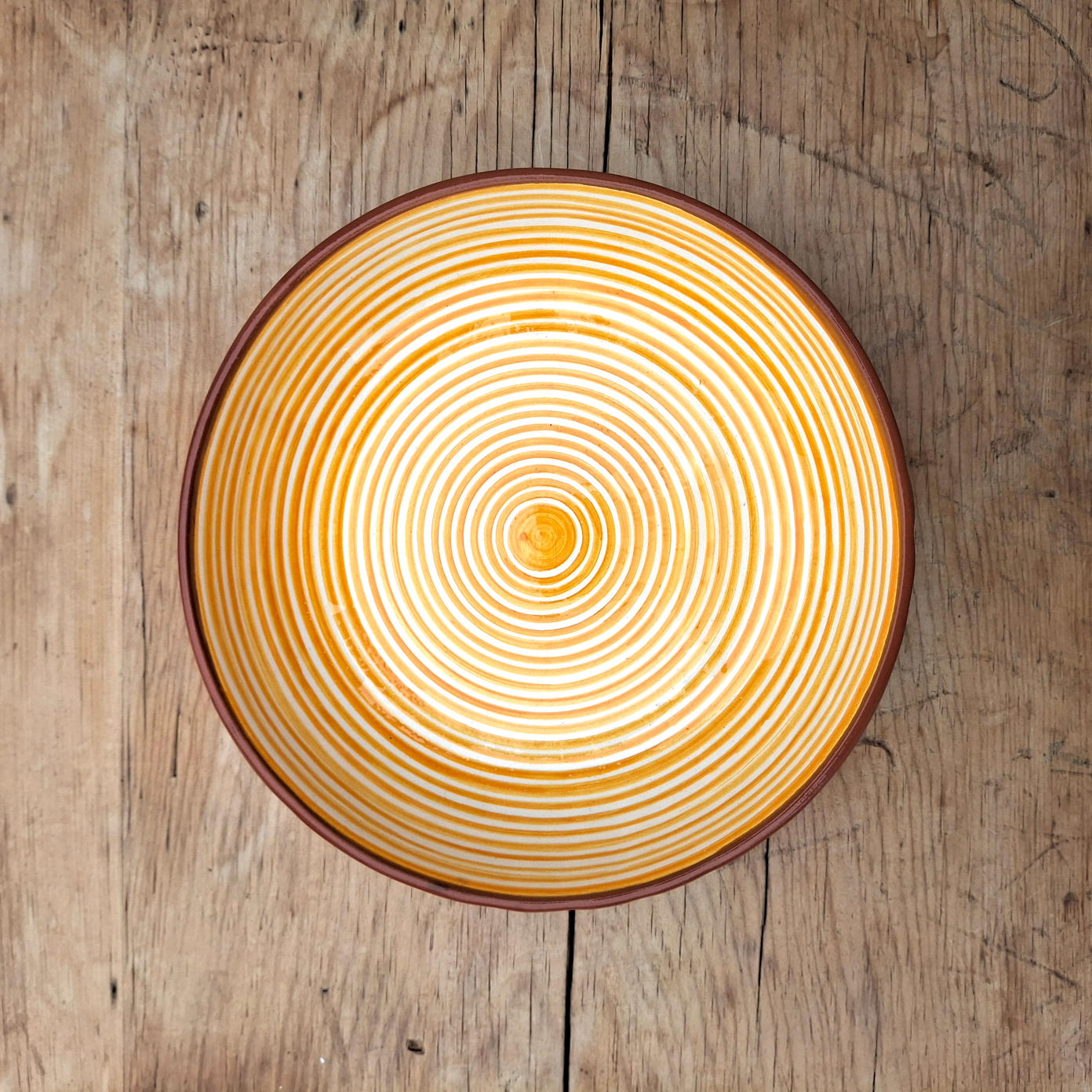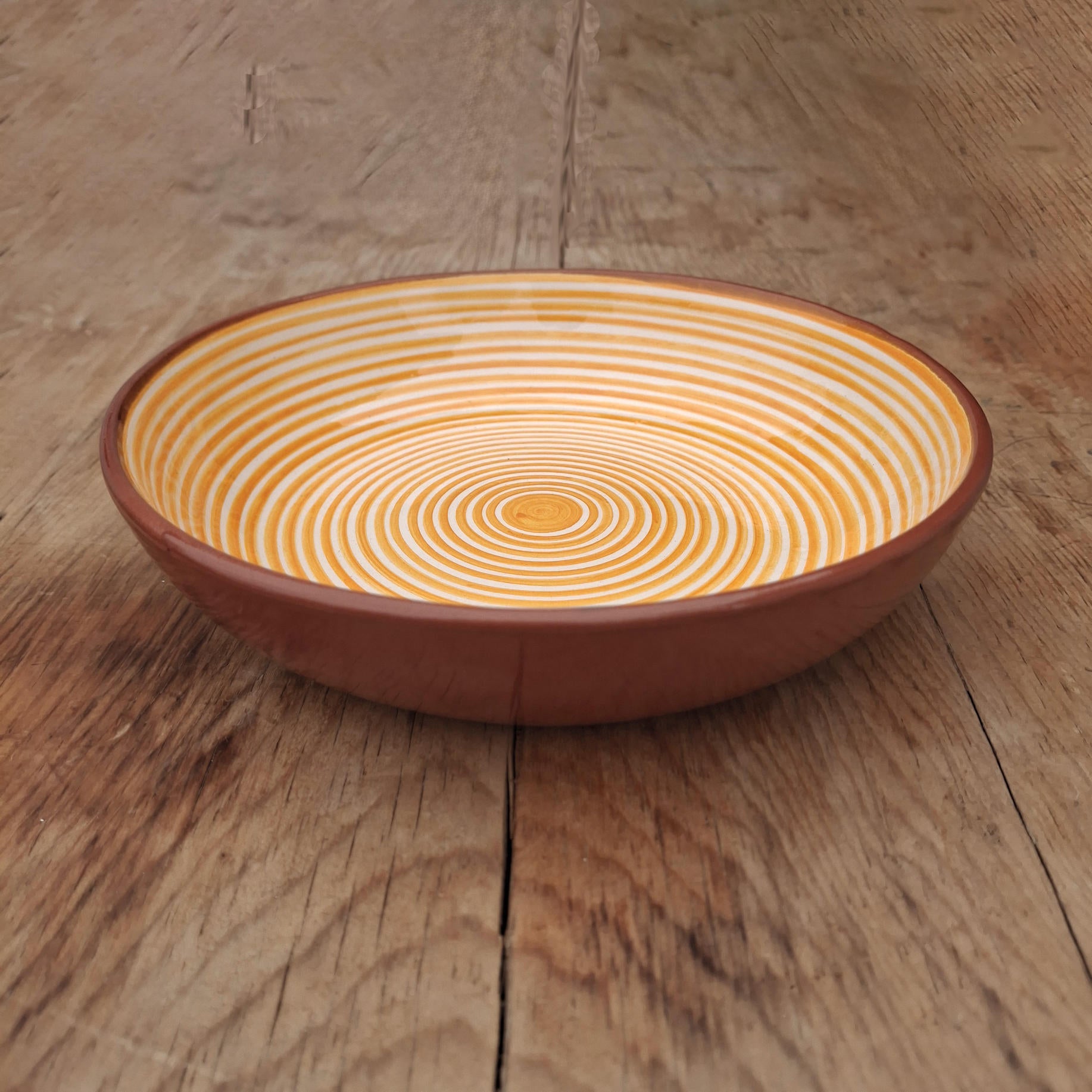 This terracotta regular bowl with a yellow stripes design adds a touch of traditional charm with a modern twist to any table setting. Expertly wheel-thrown and hand-painted in Portugal. This bowl is suitable for serving snacks, tapas, desserts, main dishes, or as a decorative piece. Versatile and stylish, it's a must-have for any home.