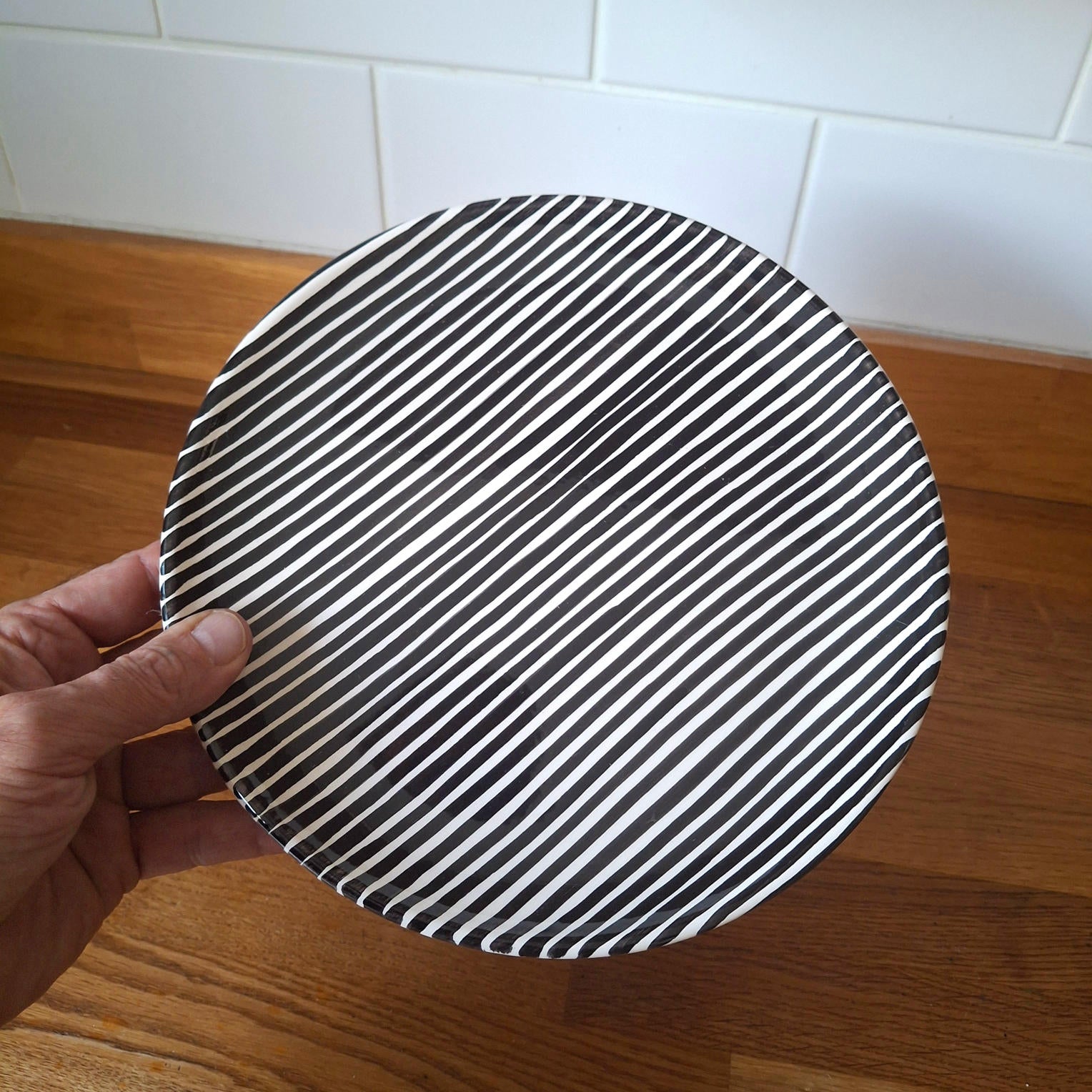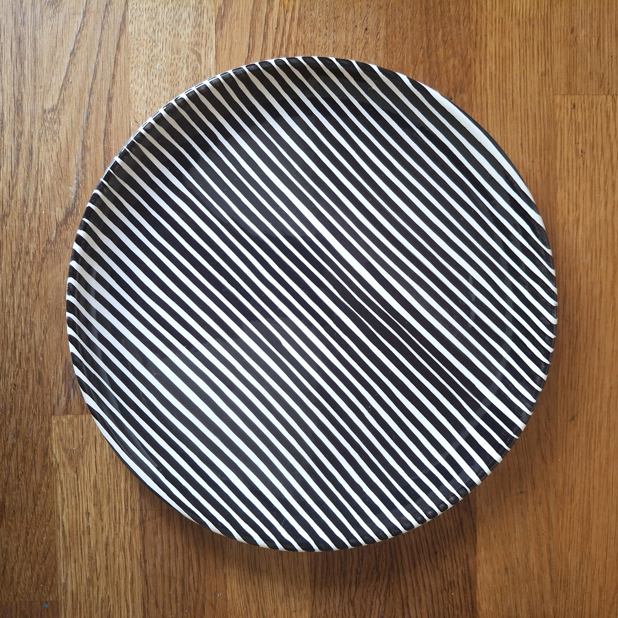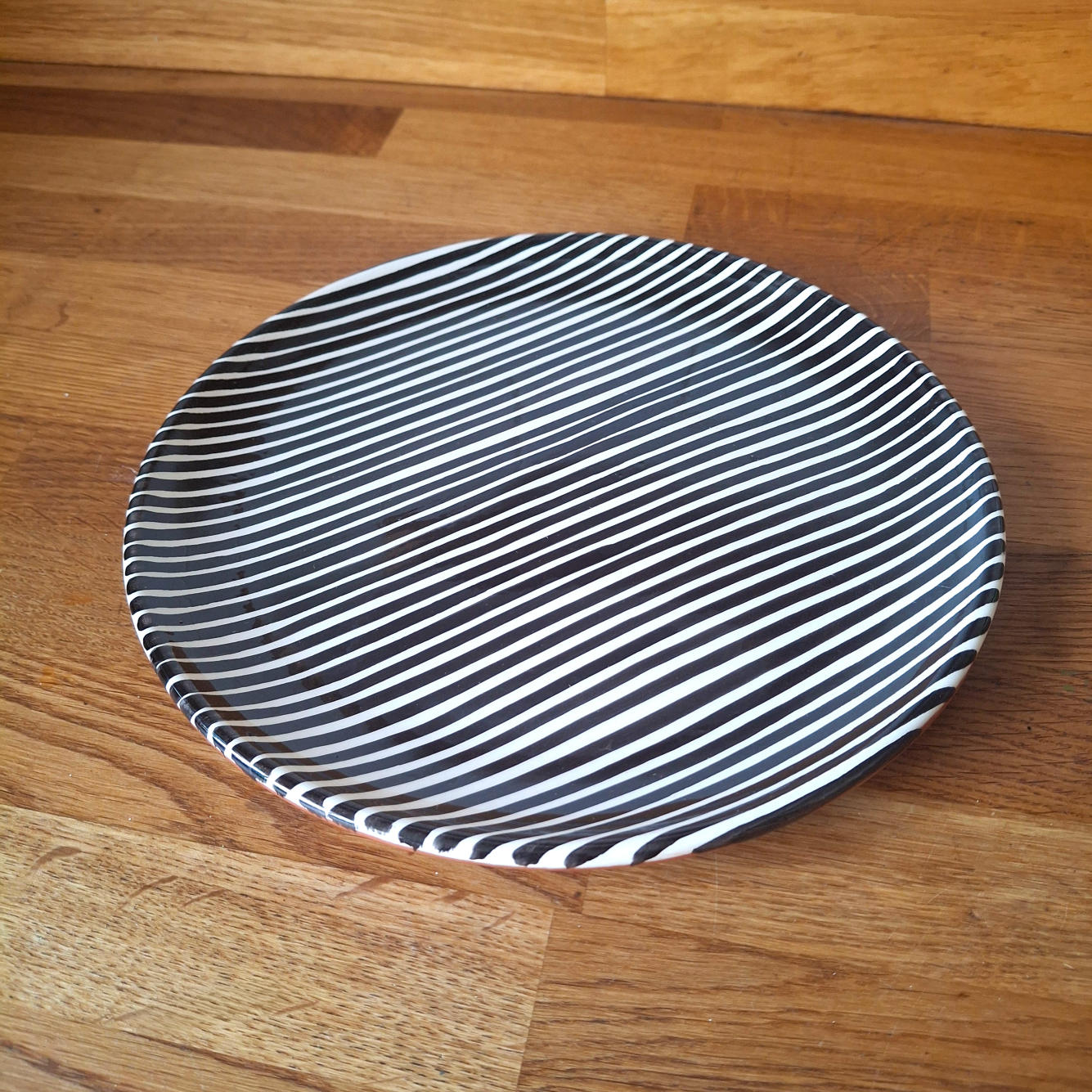 This terracotta side plate with a black stripes design adds a touch of traditional charm with a modern twist to any table setting. Expertly wheel-thrown and hand-painted in Portugal. This small plate is suitable for serving snacks, tapas, desserts, salads, or as a decorative piece. Versatile and stylish, it's a must-have for any home.