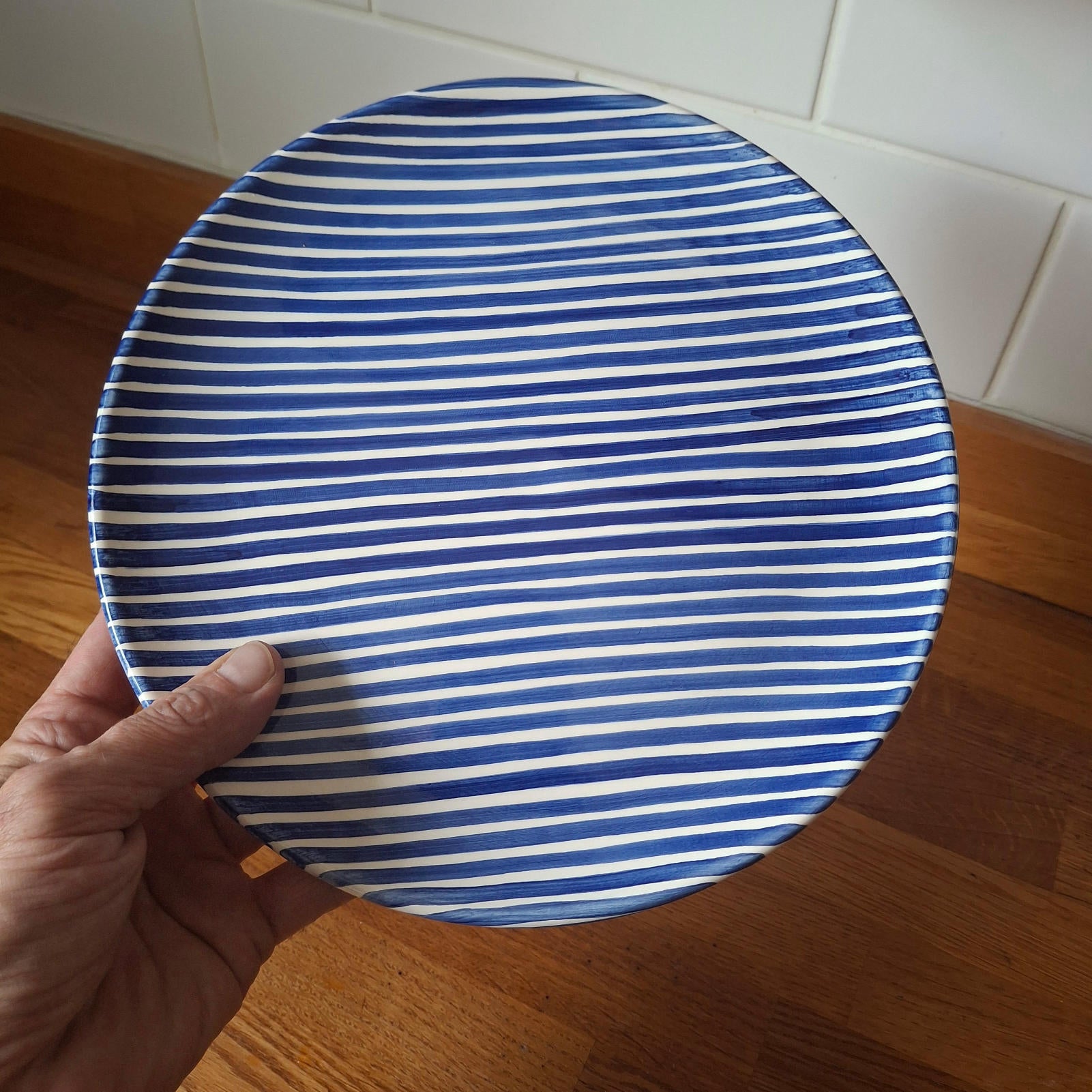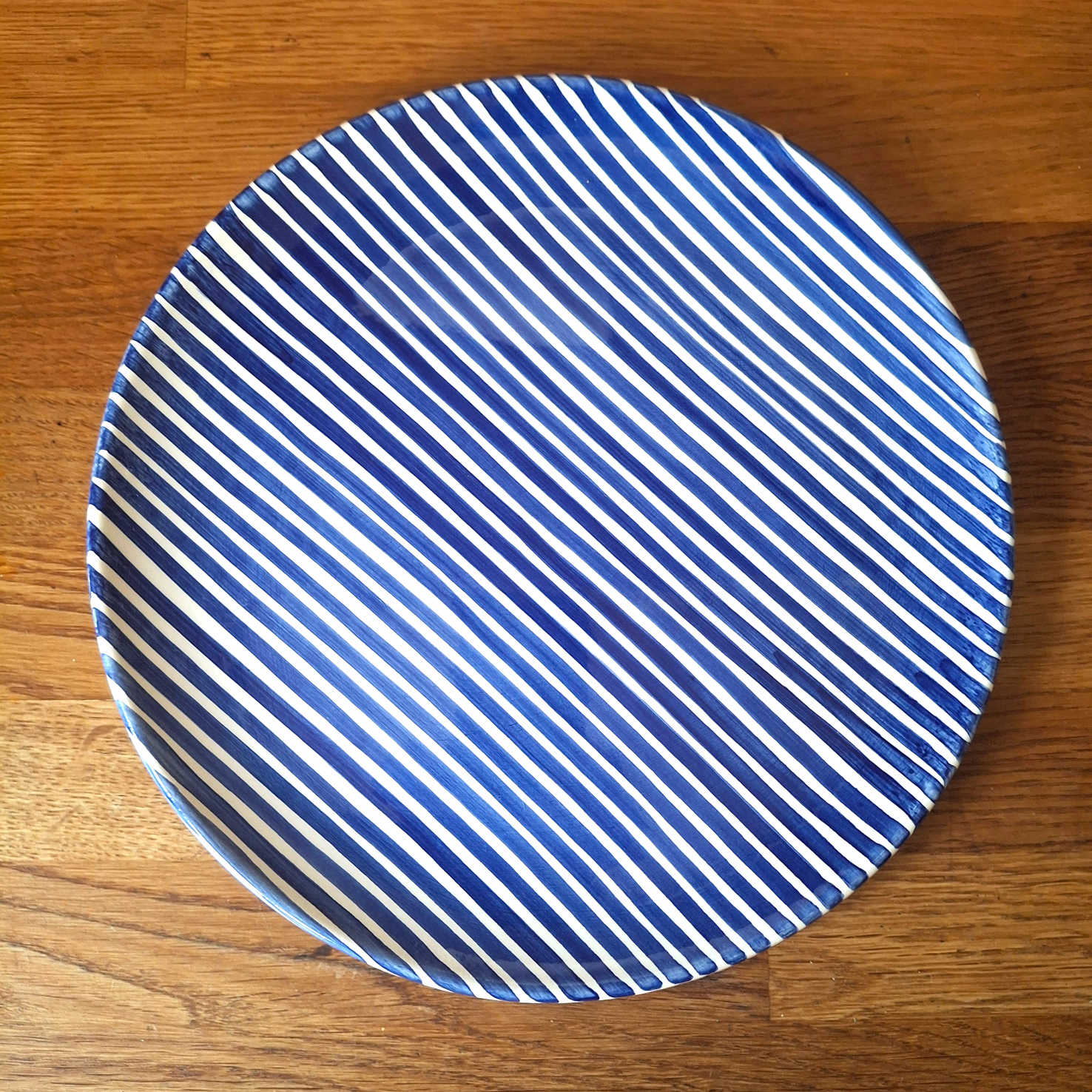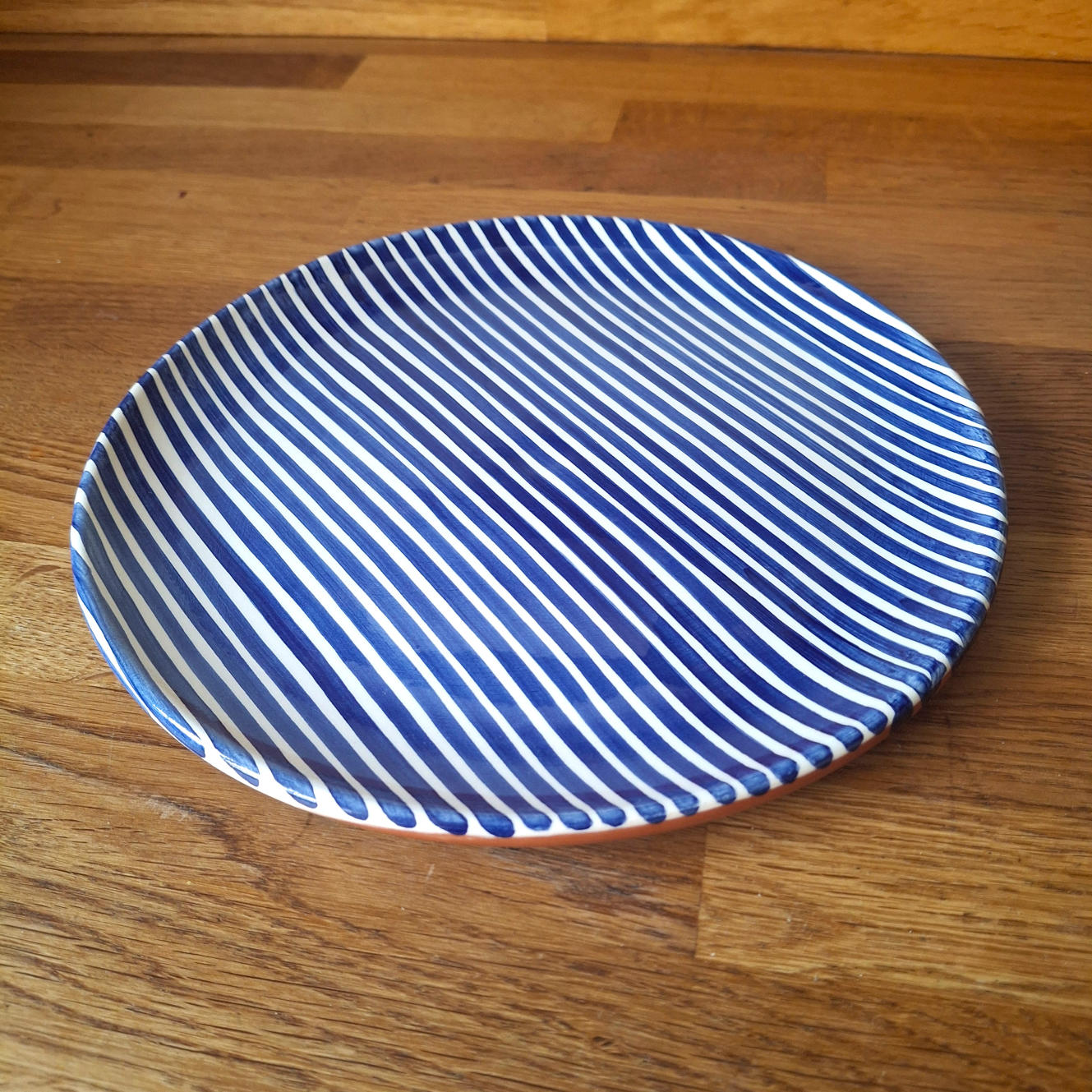 This terracotta side plate with a blue stripes design adds a touch of traditional charm with a modern twist to any table setting. Expertly wheel-thrown and hand-painted in Portugal. This small plate is suitable for serving snacks, tapas, desserts, salads, or as a decorative piece. Versatile and stylish, it's a must-have for any home.