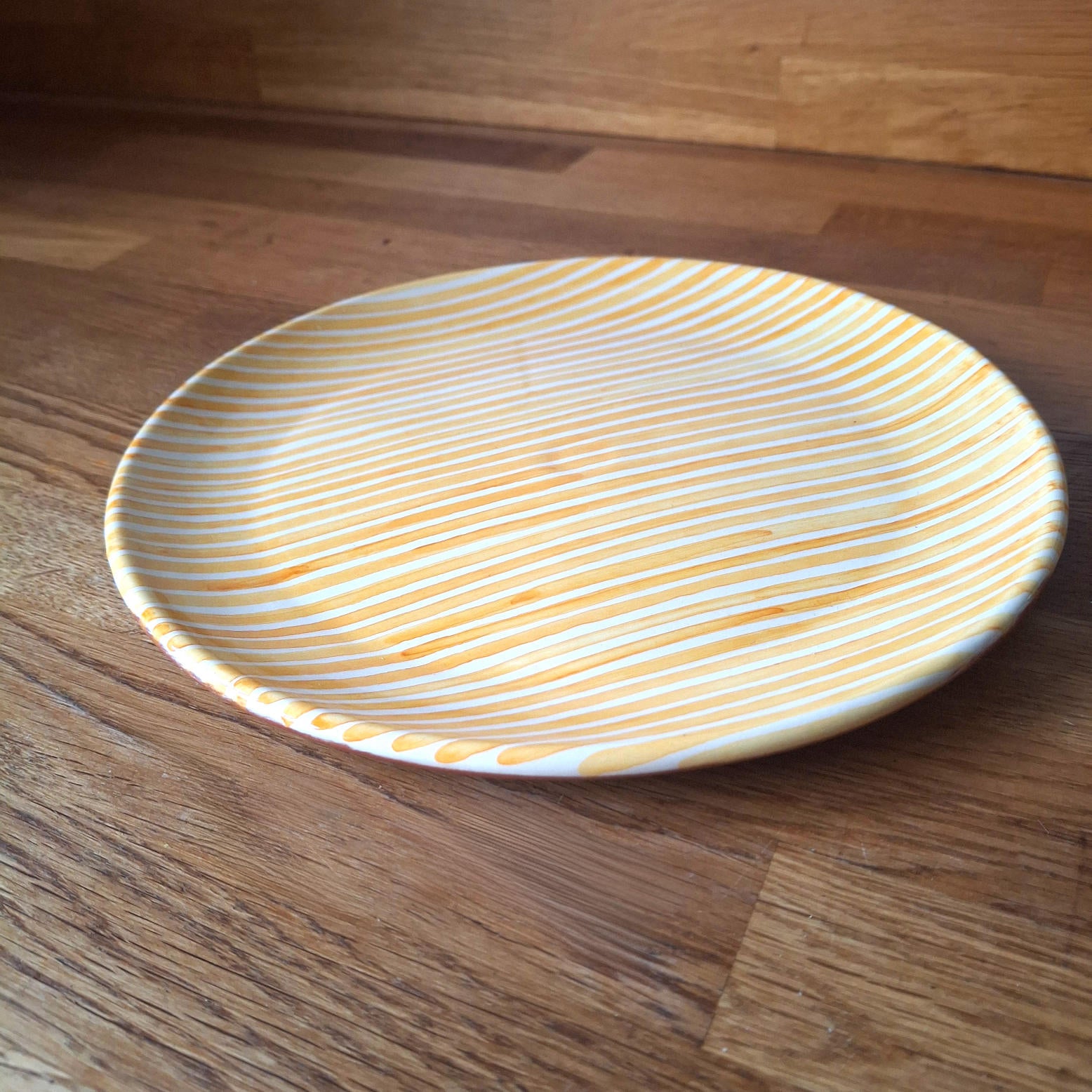 This terracotta side plate with a yellow stripes design adds a touch of traditional charm with a modern twist to any table setting. Expertly wheel-thrown and hand-painted in Portugal. This small plate is suitable for serving snacks, tapas, desserts, salads, or as a decorative piece. Versatile and stylish, it's a must-have for any home.