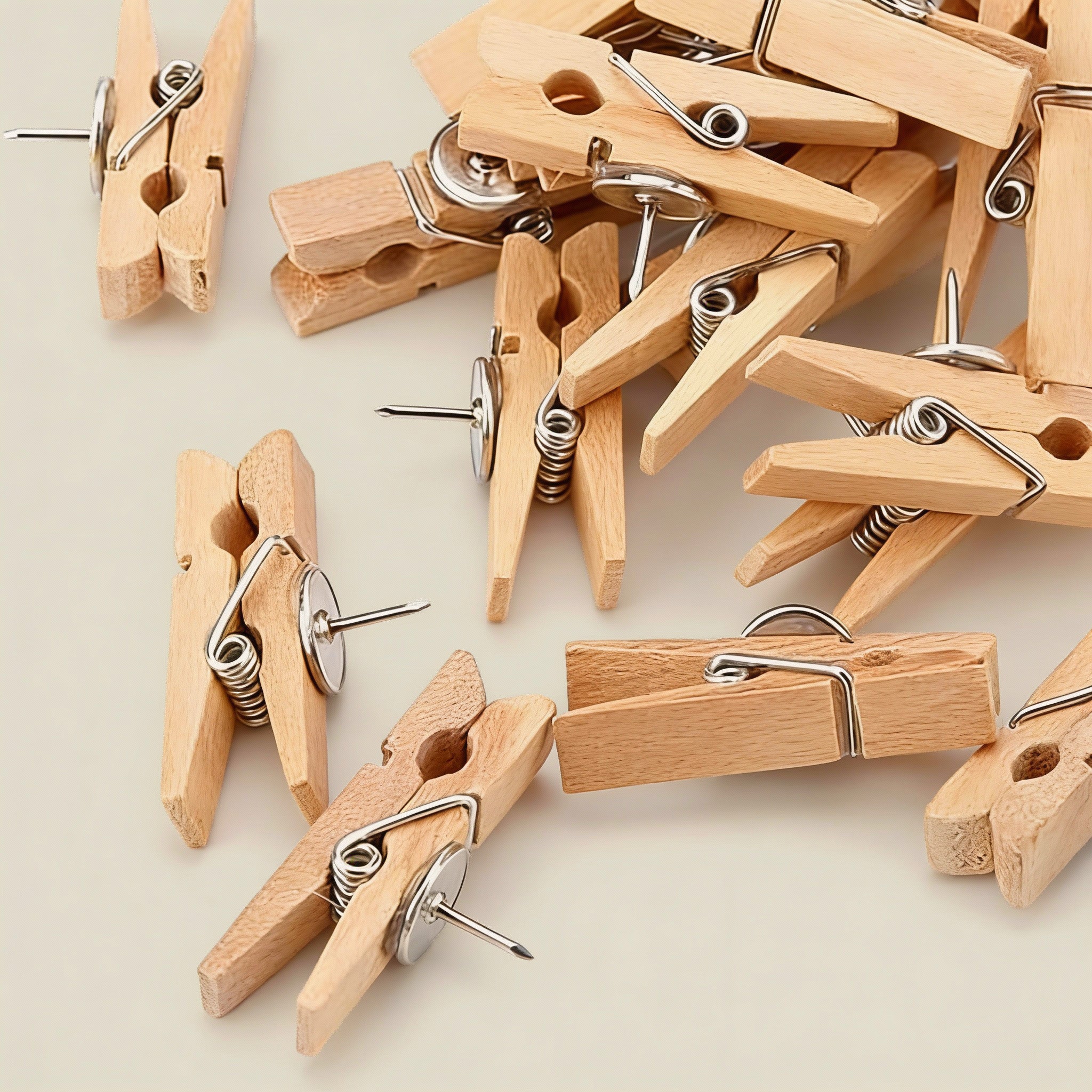 Crafted from natural wood, this 30-piece collection of peg-style push pins offers a refined approach to notice board displays. They secure prints, photos, and papers firmly in place without pricking them. Ideal for creative professionals, curators, and anyone seeking damage-free presentation solutions. The classic peg design combines aesthetic appeal with dependable functionality.
